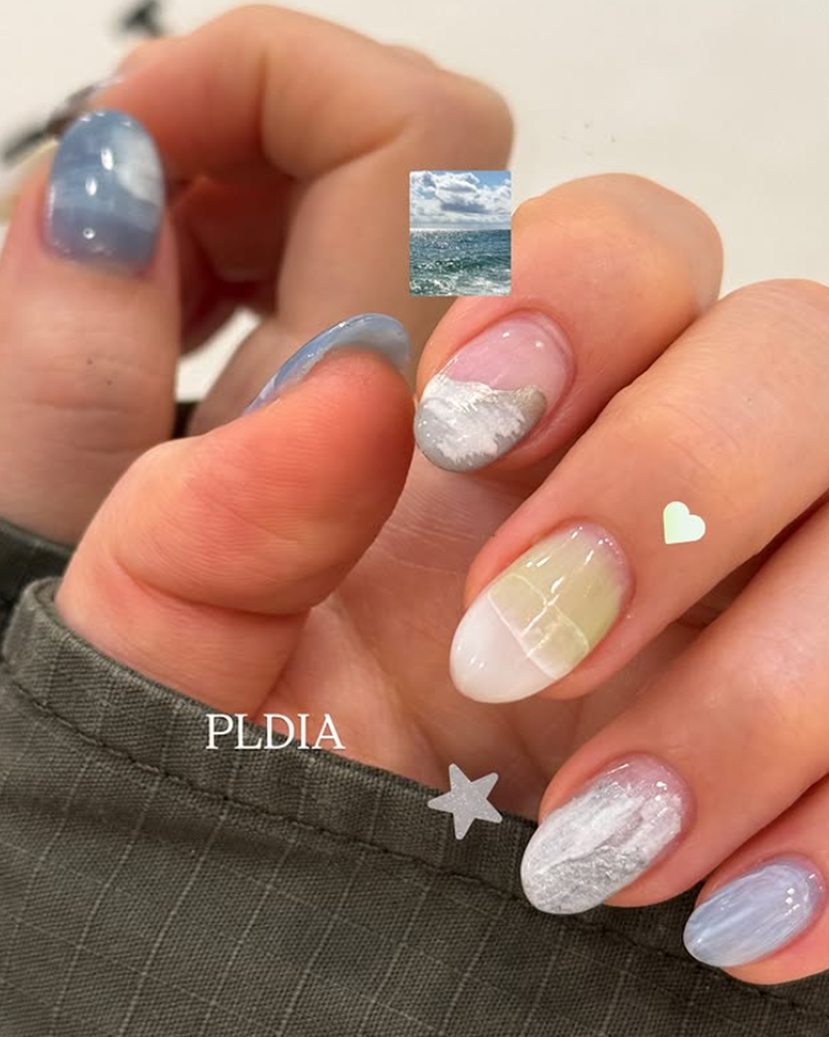 마치 손끝에 작은 바다 조각을 올린 것 같은 네일이에요.